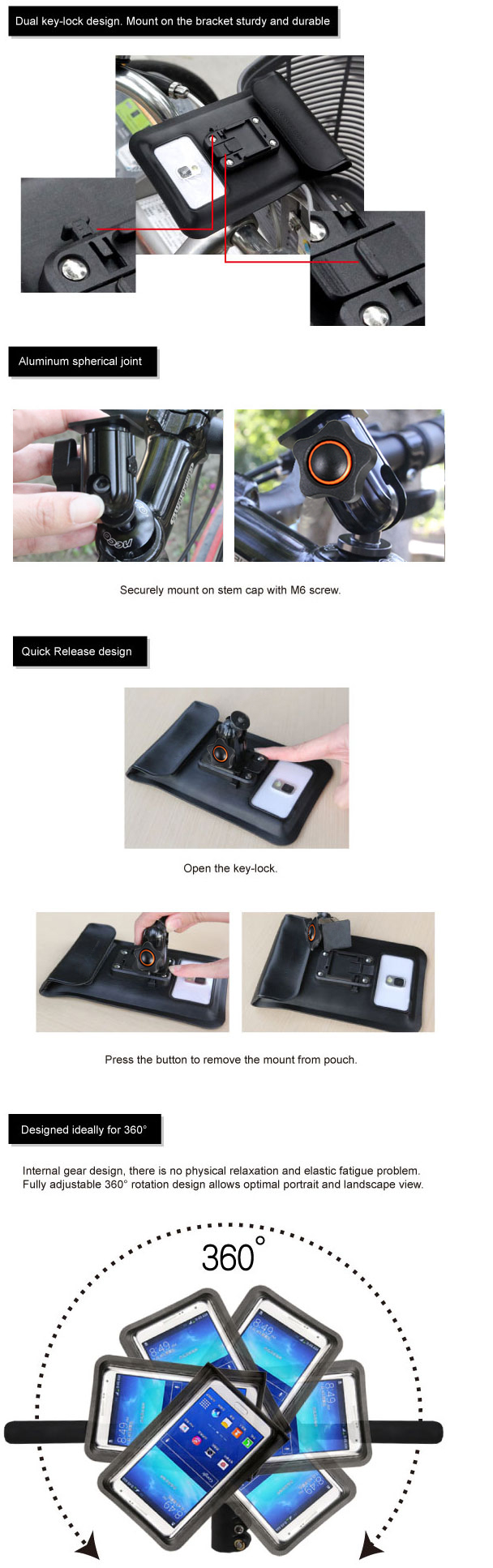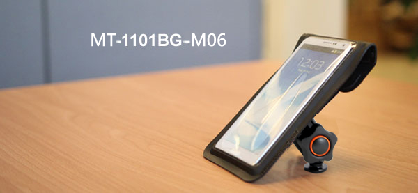 MT-1101BG-M06 allows you to hold your smartphone on the mount of handlebar screw of bicycle. Its waterproof pouch not only can protect your smartphone when you are driving, but also make you enjoy your smartphone more easily and conveniently.